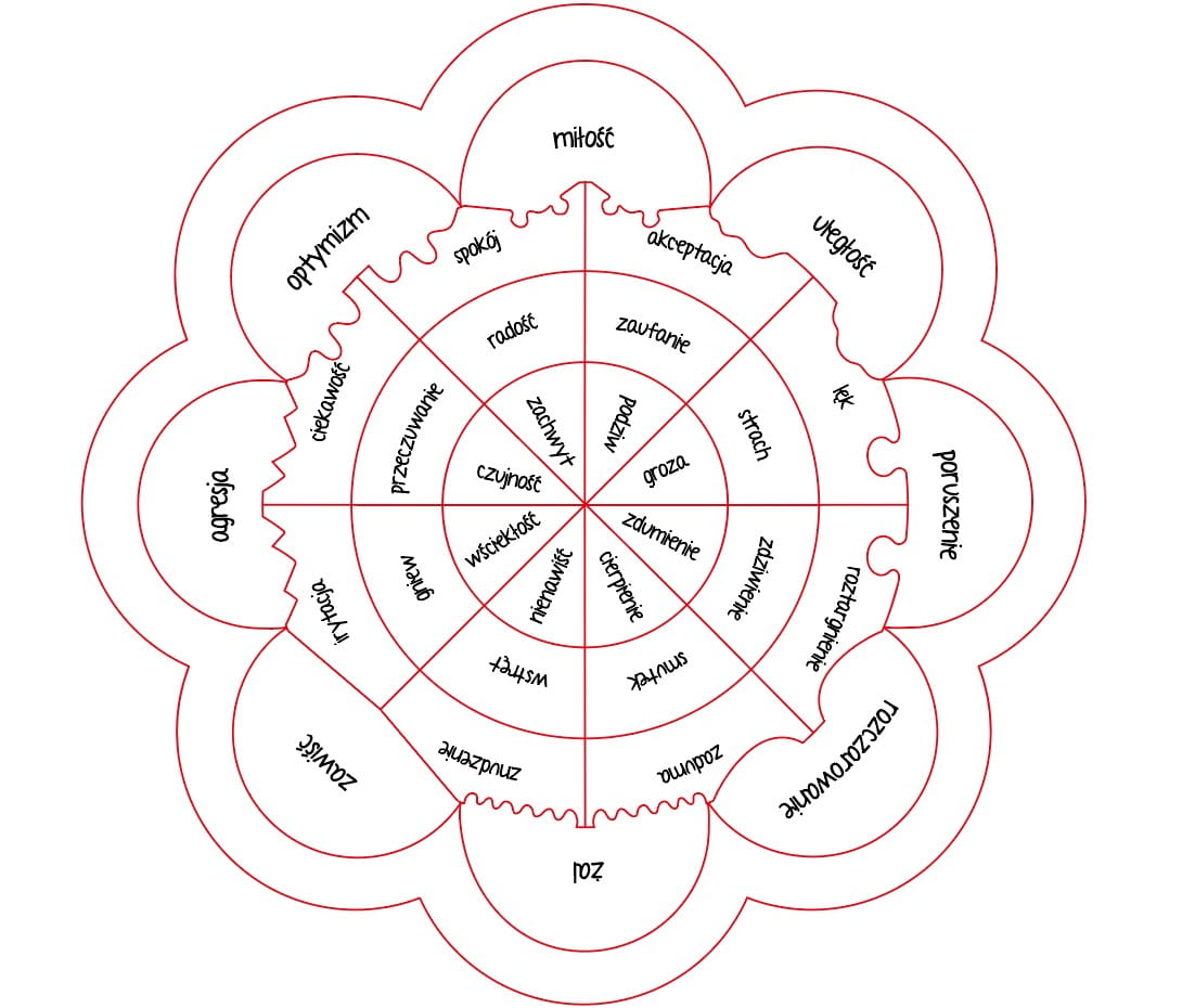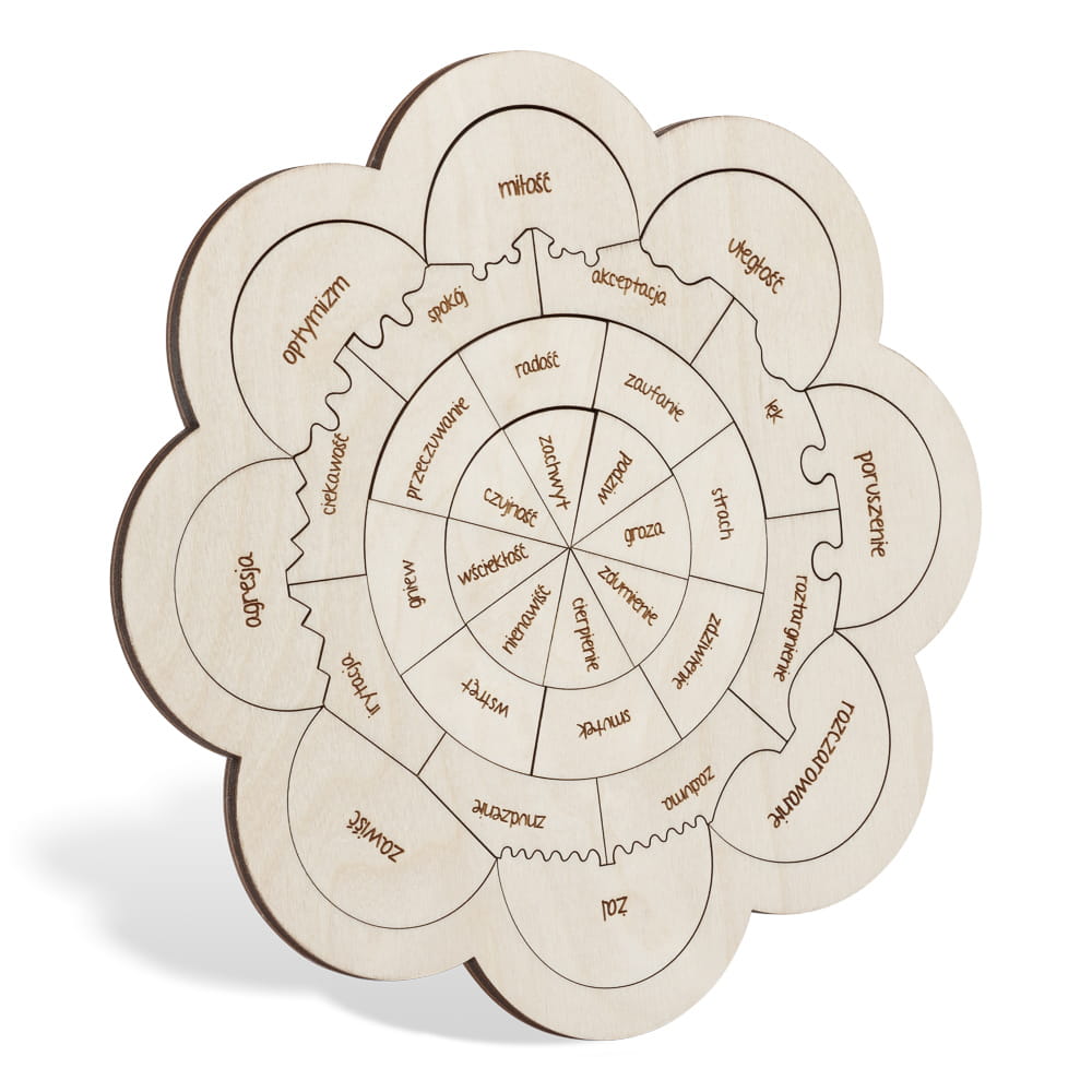 Złość, smutek, miłość, radość, spełnienie, strach czy rozczarowanie to złożone emocje, u których podstawy leżą inne niezaspokojone lub zaspokojone potrzeby. Cytując Francoisa Rebelais: „Nie da się dojrzeć całej góry patrząc jedynie na jej szczyt”. Tak samo nie możemy zrozumieć, zaakceptować i pracować z emocjami nie rozumiejąc z jakich impulsów wyrastają. Puzzle "Co w duszy gra" powstały na podstawie koła emocji Plutchika. Ten amerykański psycholog zaproponował istnienie ośmiu podstawowych emocji, które mieszając się, tworzą złożone formy odpowiedzialne za konkretne przeżycia. Puzzle ułożone w formie rozkwitającego kwiatostanu, neutralne w kolorze, pozwolą Wam zrozumieć złożoność emocji, które towarzyszą nam w codziennym życiu. Dodane do nich zestawy kredek, umożliwiają pokolorowanie elementów na różnorodne tonacje barwne, które ułatwią zrozumienie złożoności uczuć, ich wzajemne przenikanie się i dopełnianie. Spróbujcie dojrzeć co stoi za waszymi emocjami!